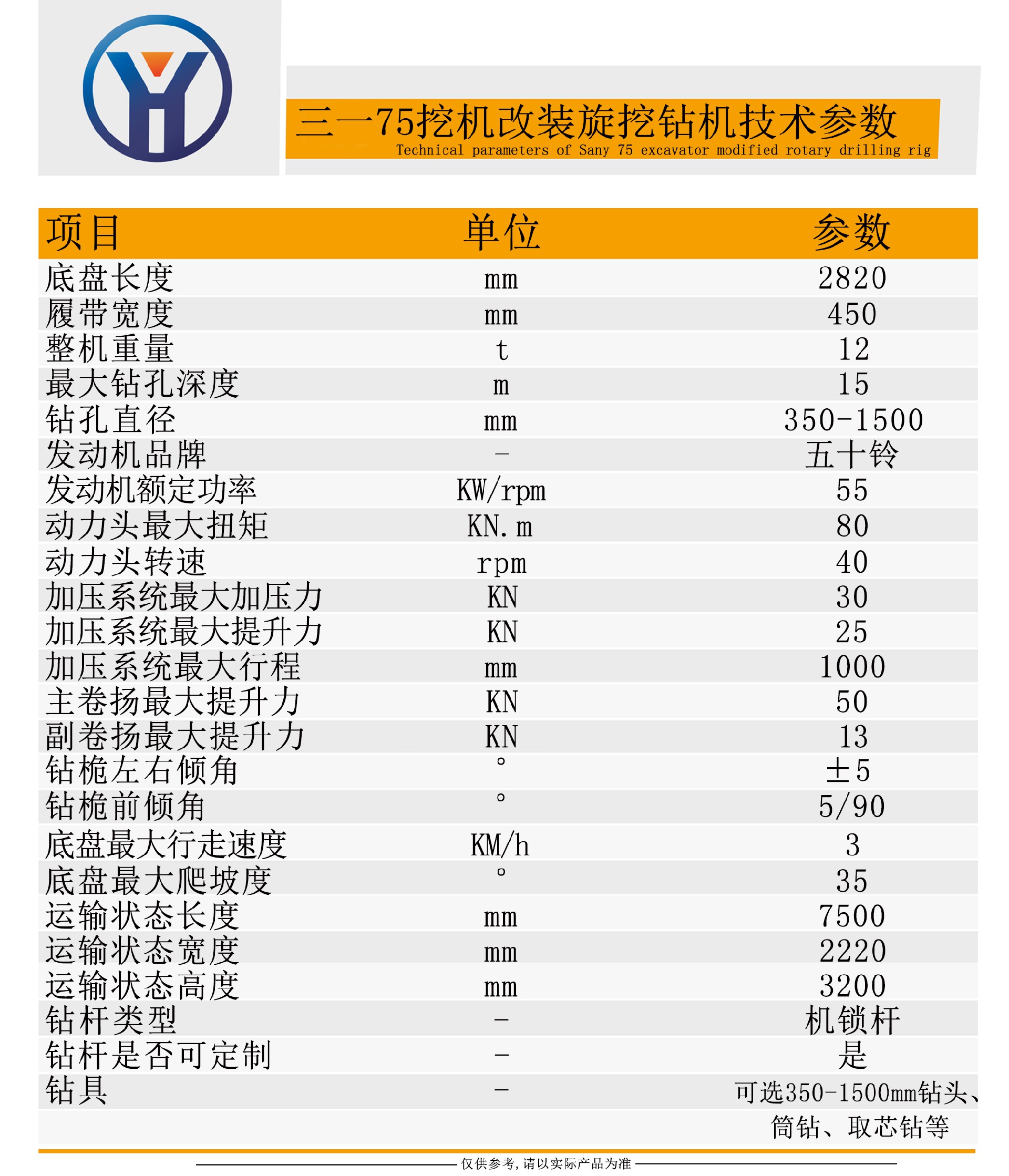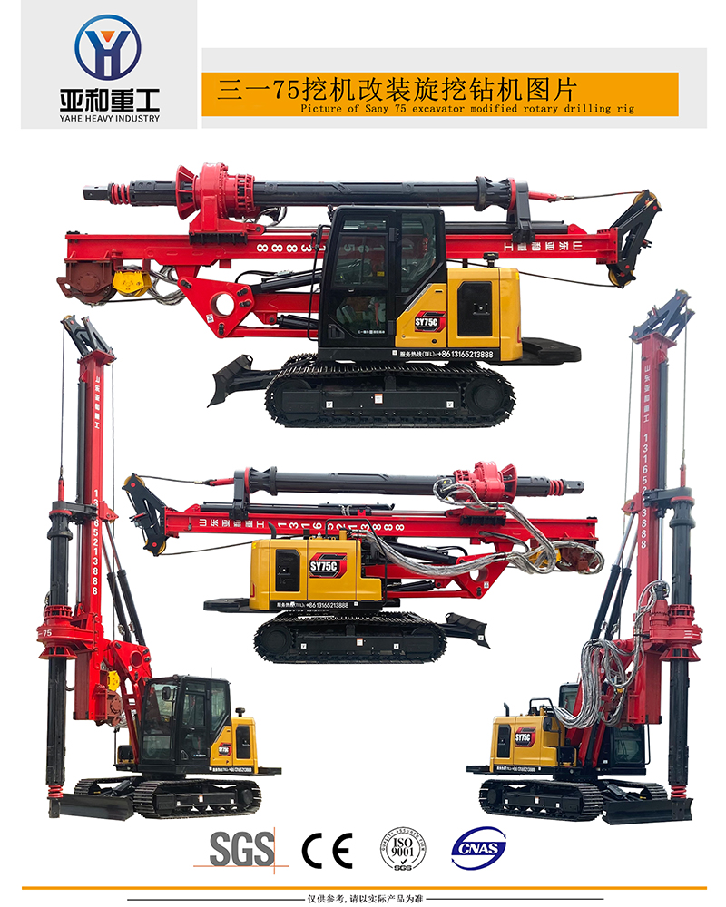 描述:采用三一SR75挖机做平台改装为小型旋挖钻机。采用进口五十铃发动机,钻孔深度15m,孔径350-1500mm,整体重量12t,体积小巧,方面运输转场,尤适用于低窄小空间施工使用。